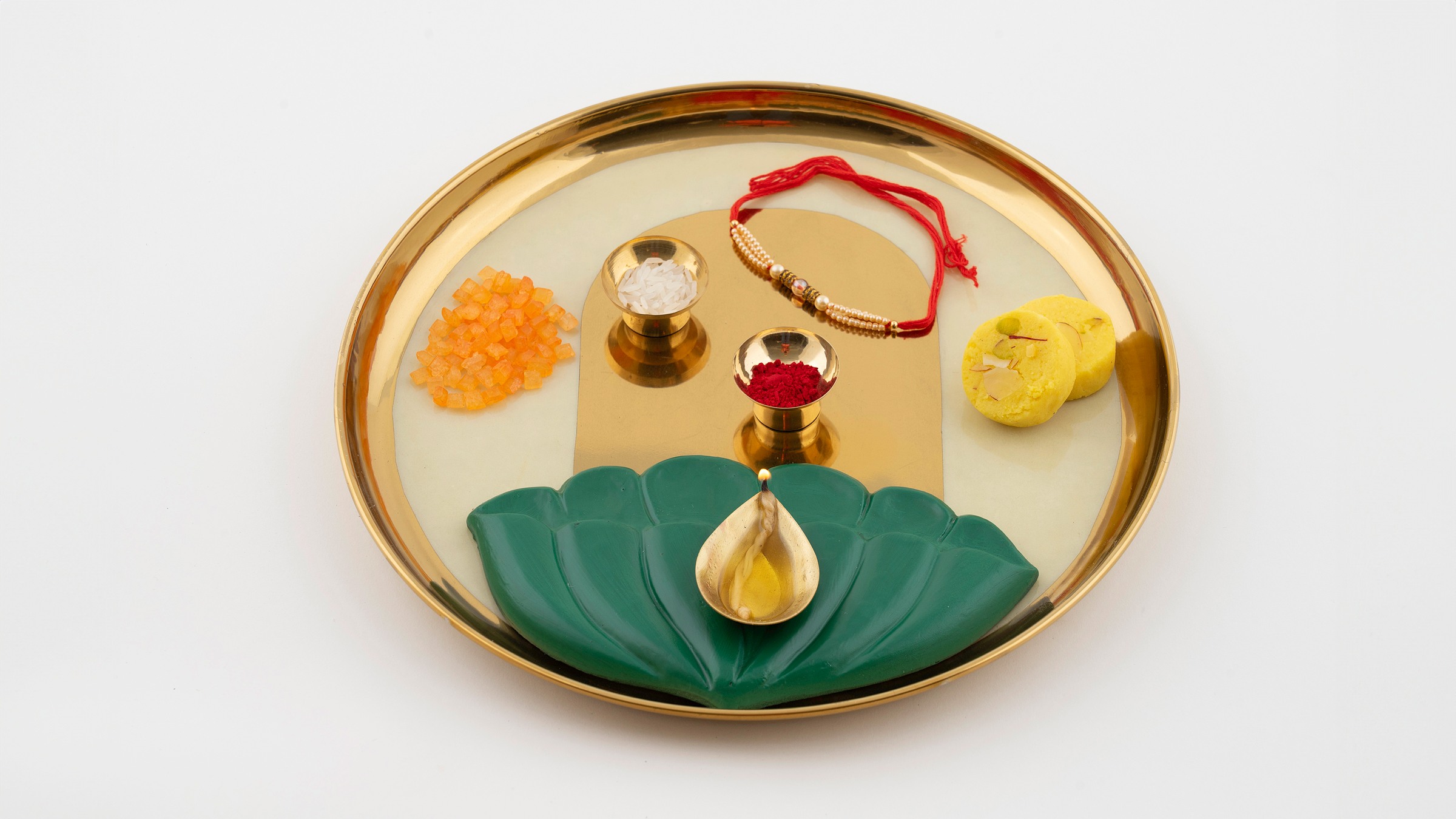 Puja Thali with diya, vati and a lotus leaf